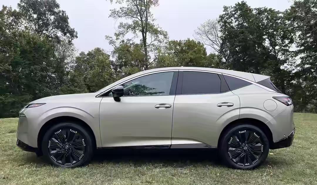 在车身的侧面,我们可以看到全新一代的日产楼兰的效果十分的跨界,它的D柱非常的特别,采用的是X字形设计,车窗的风格非常的凌厉,还有黑色的后视镜。新车采用下沉式的车顶,车身的后翼子板的位置采用突出的线条,车的底部还有凌厉的包围,轮眉也非常的特别,车轮毂采用的是非常干练的造型,而且它采用了黑色的涂装,很有辨识度。